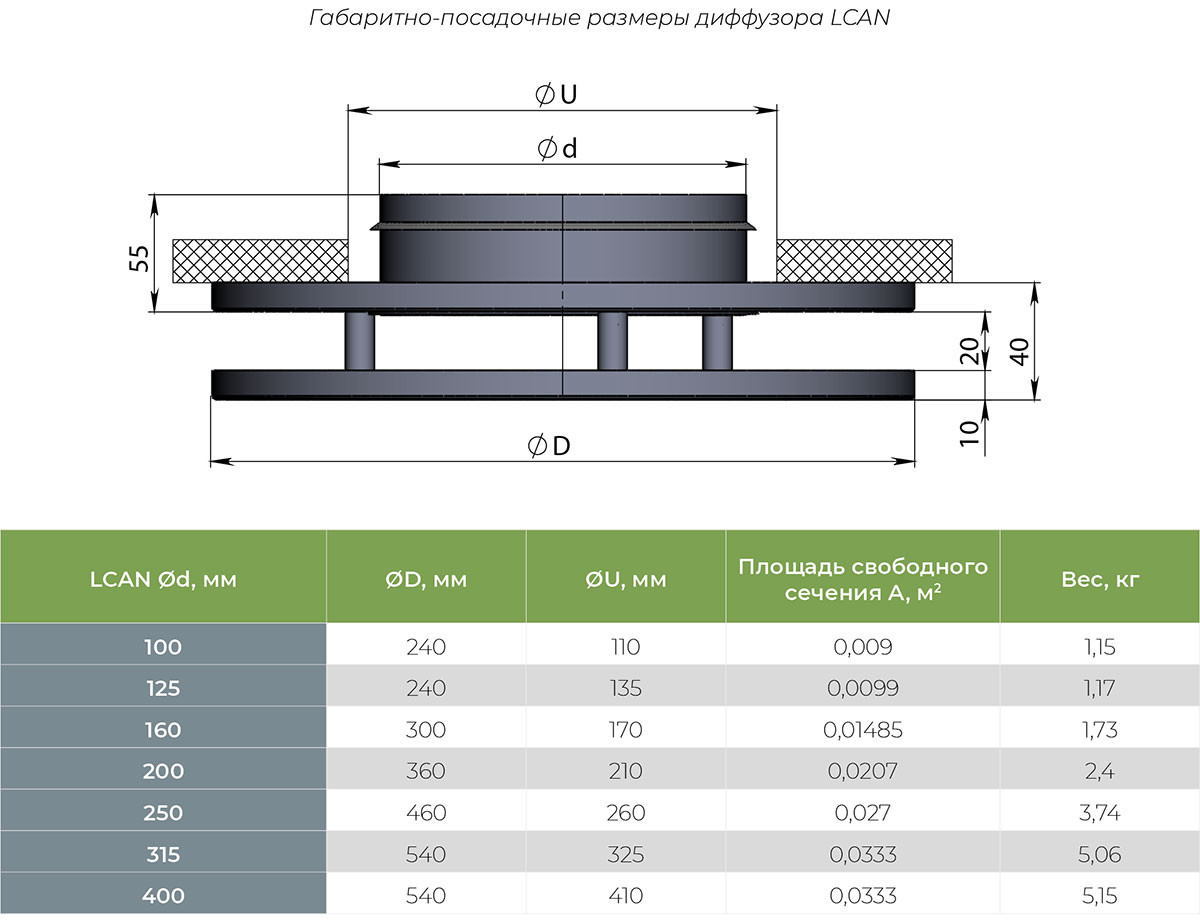 Диффузоры изготавливаются из оцинкованной листовой стали толщиной 0,9 мм и по умолчанию покрываются полимерной порошковой краской белого цвета RAL 9016M (матовая). Камера статического давления по умолчанию поставляется без покрытия. По запросу возможна окраска в любой цвет по международной шкале RAL как лицевой панели, так и камеры. Заказать камеру статического давления для диффузора LCAN.