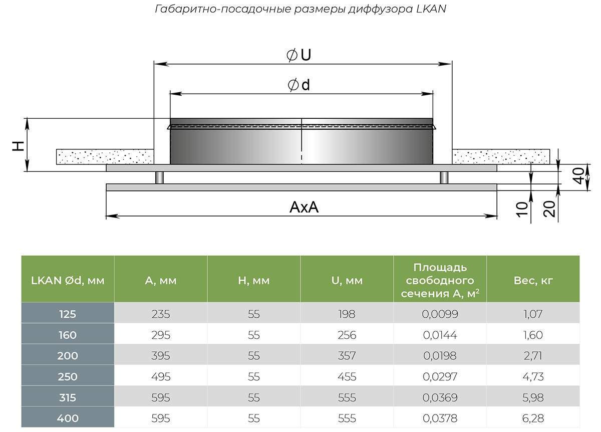 Диффузоры изготавливаются из оцинкованной листовой стали толщиной 0,9 мм и по умолчанию покрываются полимерной порошковой краской белого цвета RAL 9016M (матовая). Камера статического давления по умолчанию поставляется без покрытия. По запросу возможна окраска в любой цвет по международной шкале RAL как лицевой панели, так и камеры. Заказать камеру статического давления для диффузора LKAN.
