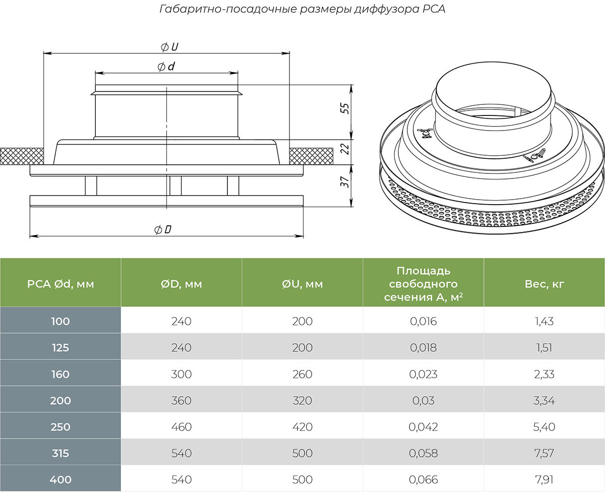Диффузоры изготавливаются из оцинкованной листовой стали толщиной 0,9 мм и по умолчанию покрываются полимерной порошковой краской белого цвета RAL 9016M (матовая). Камера статического давления по умолчанию поставляется без покрытия. По запросу возможна окраска в любой цвет по международной шкале RAL как лицевой панели, так и камеры. Заказать камеру статического давления для диффузора PCA.